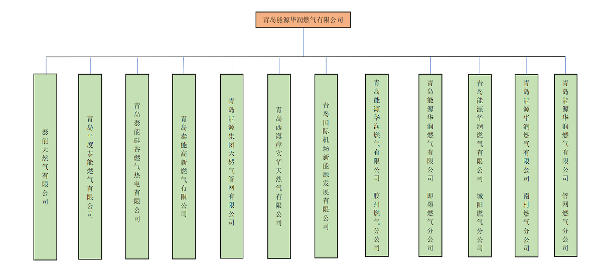 公司内设12个职能部门,下辖13个分子公司,员工2100余人,建有6座门站、拥有145万管道天然气客户,公司燃气特许经营区域覆盖青岛市内三区、高新区全部及崂山区、城阳区、即墨区(含蓝色硅谷核心区)、西海岸新区、平度市、胶州市部分区域,总特许经营区域3500平方公里。
