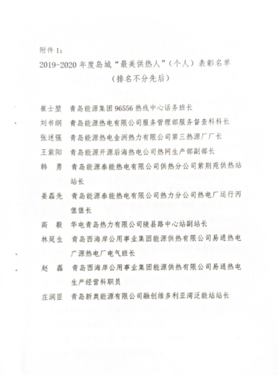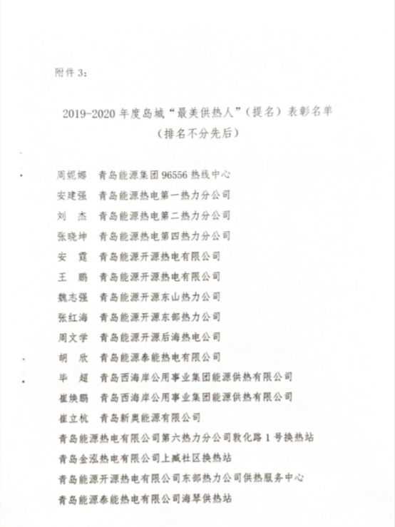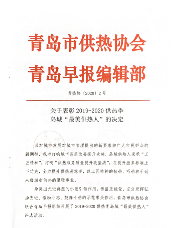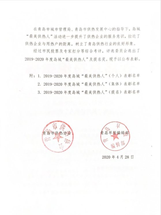 青岛市供热协会联合青岛早报组织开展的2019-2020供热季岛城“最美供热人”评选活动,经过10万余名市民投票及专家打分等综合考评,于“五一”劳动节前夕正式揭晓。