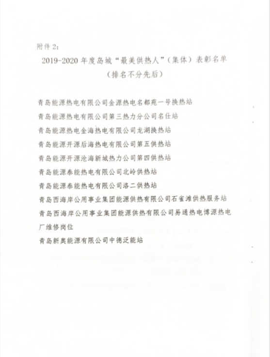 集团96556热线话务班长崔士堃等6名员工荣获岛城“最美供热人”(个人表彰)、金源热电名都苑一号换热站等7个集体获得岛城“最美供热人”(集体)表彰。集团96556热线中心话务员周妮娜、能源热电第六热力分公司敦化路1号供热站等14个个人及集体获提名表彰。