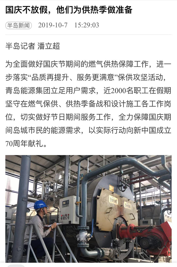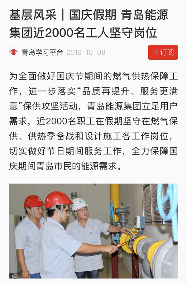 国庆节期间,集团近2000名职工在假期坚守燃气保供、供热季备战、服务等各工作岗位,认真落实“品质再提升、服务更满意”保供攻坚活动,全力保障国庆期间青岛市民的能源需求。青岛电视台QTV-1频道两次到集团基层站点和工作现场,对冬季供热前期准备工作进行了实地采访,并在《今日60分》栏目播出。“学习强国”青岛学习平台对集团国庆期间保供工作进行了推送;同时,《大众网》、《齐鲁壹点》、《半岛新闻》、《信网》等多家网络媒体陆续对假期保障供应情况进行了报道。通过多平台、多角度的广泛宣传,展现了能源人心系用户、敢于攻坚的精神面貌,进一步提升了集团良好社会形象。