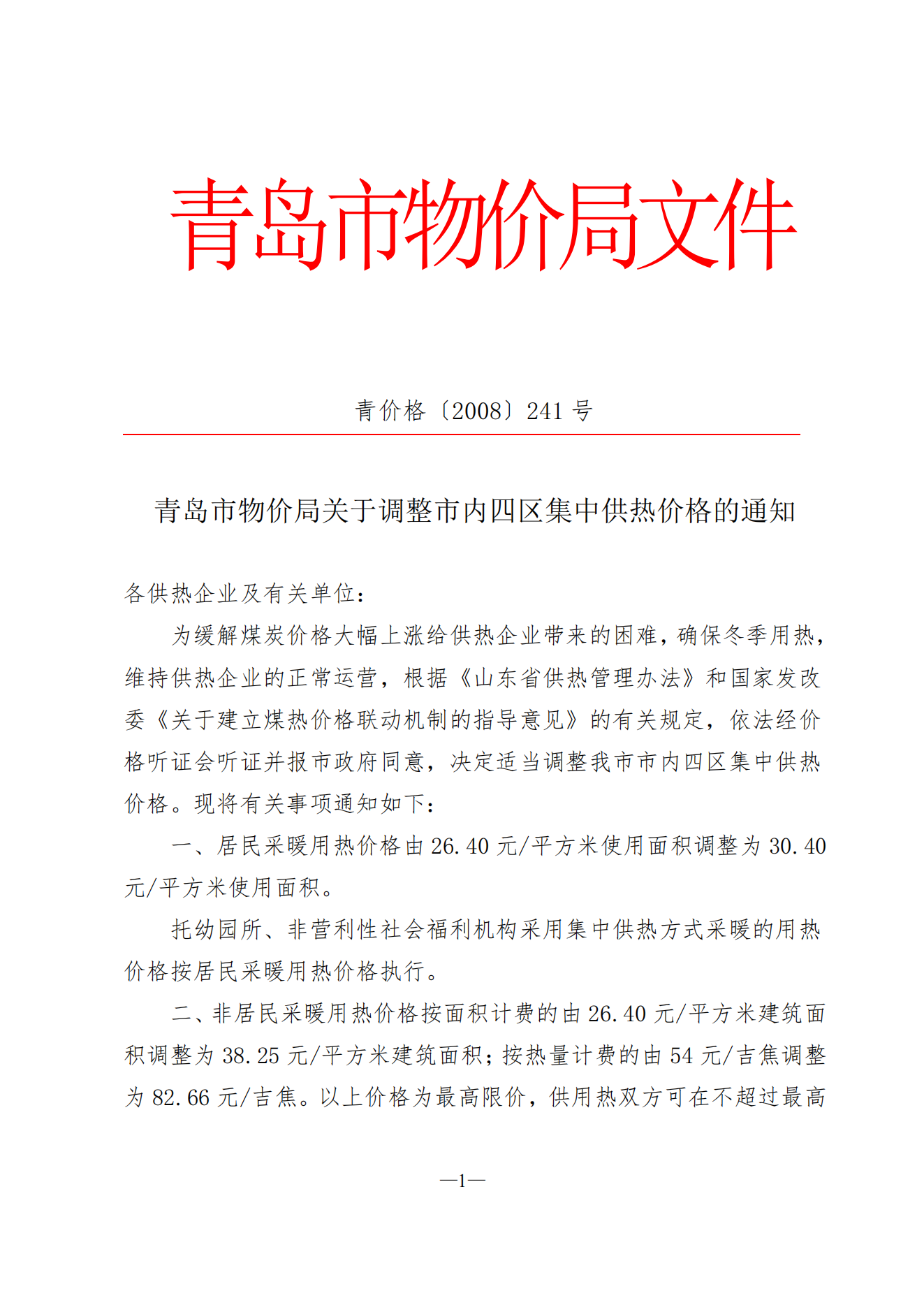 青价格【2008】241号《青岛市物价局 关于调整市内四区集中供热价格的通知》.pdf