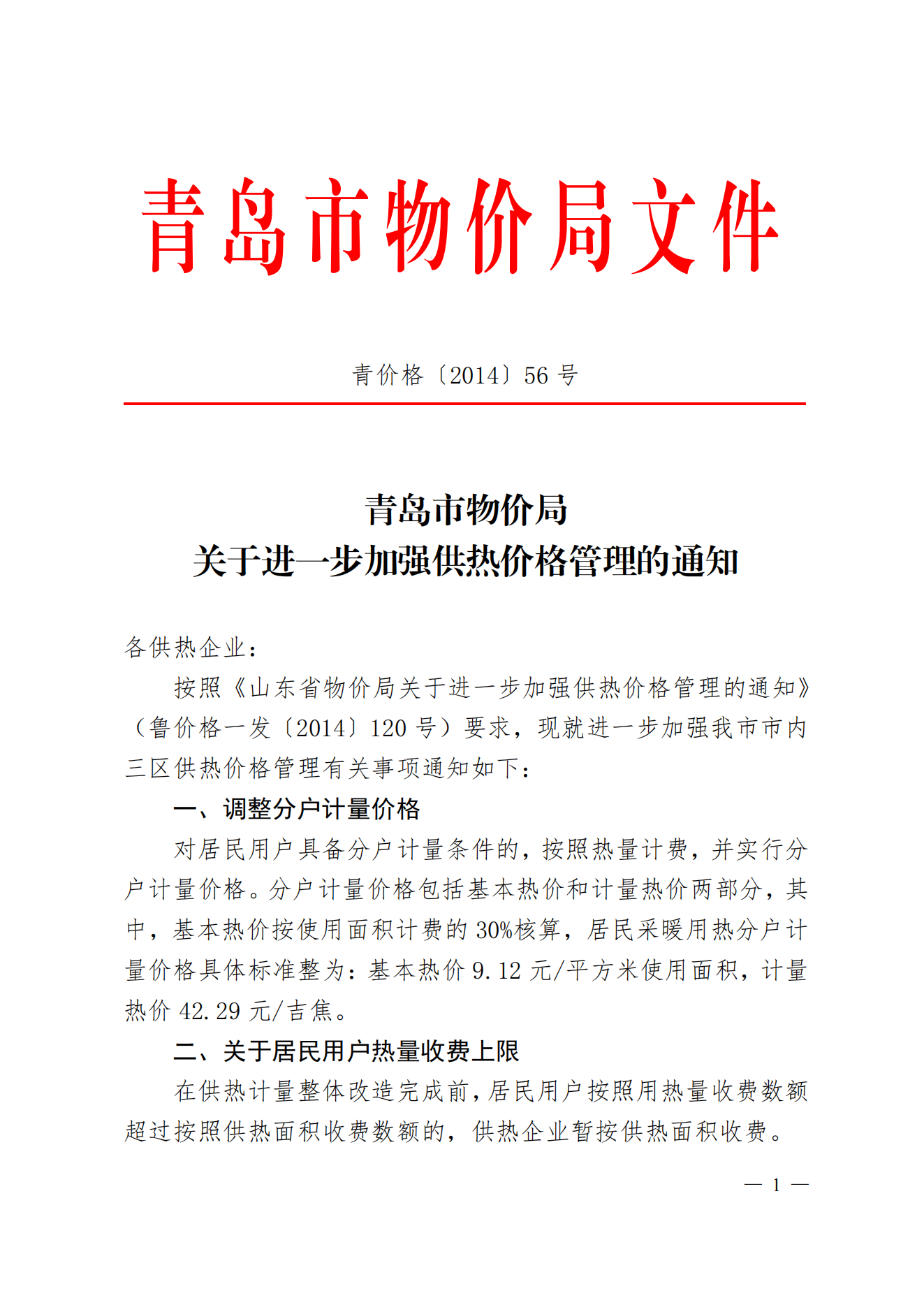 青价格【2014】56号 青岛市物价局 关于进一步加强供热价格管理的通知