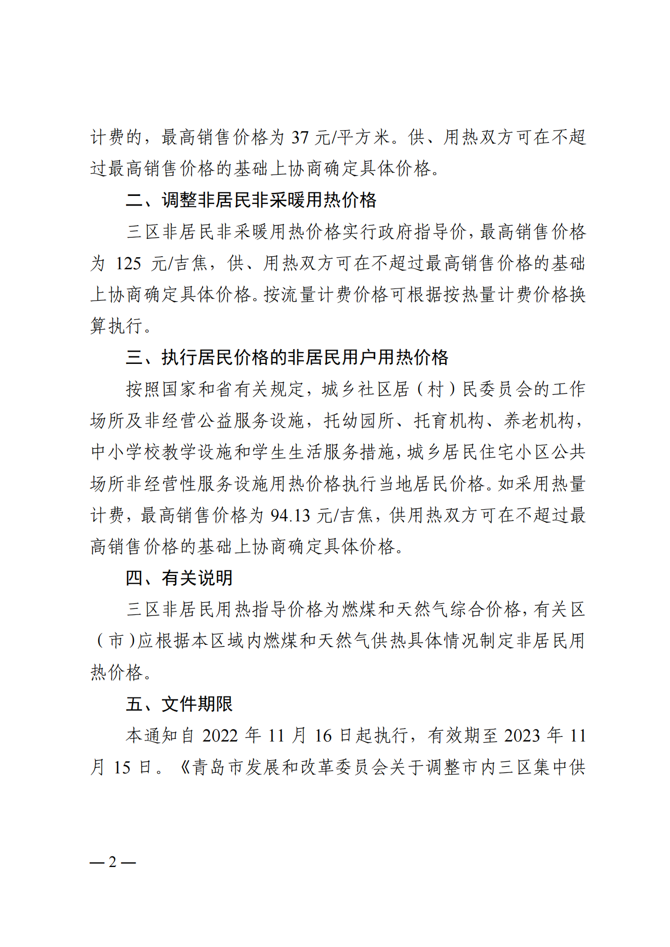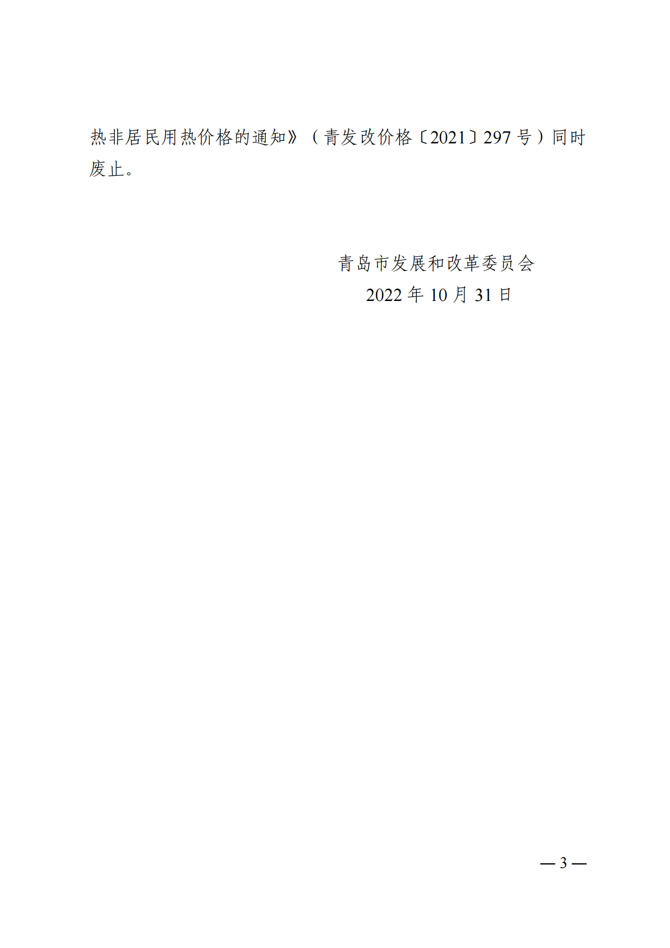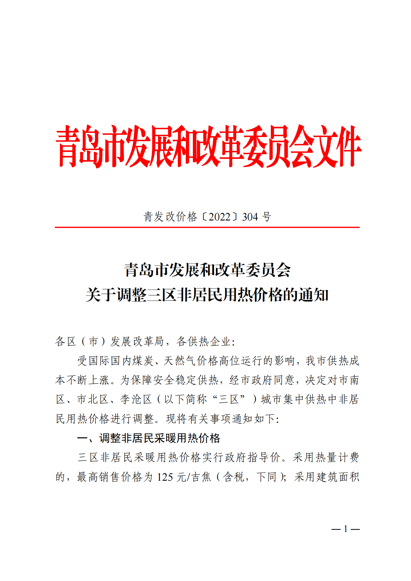 青发改价格【2022】304号 青岛市发展和改革委员会 关于调整三区非居民用热价格的通知