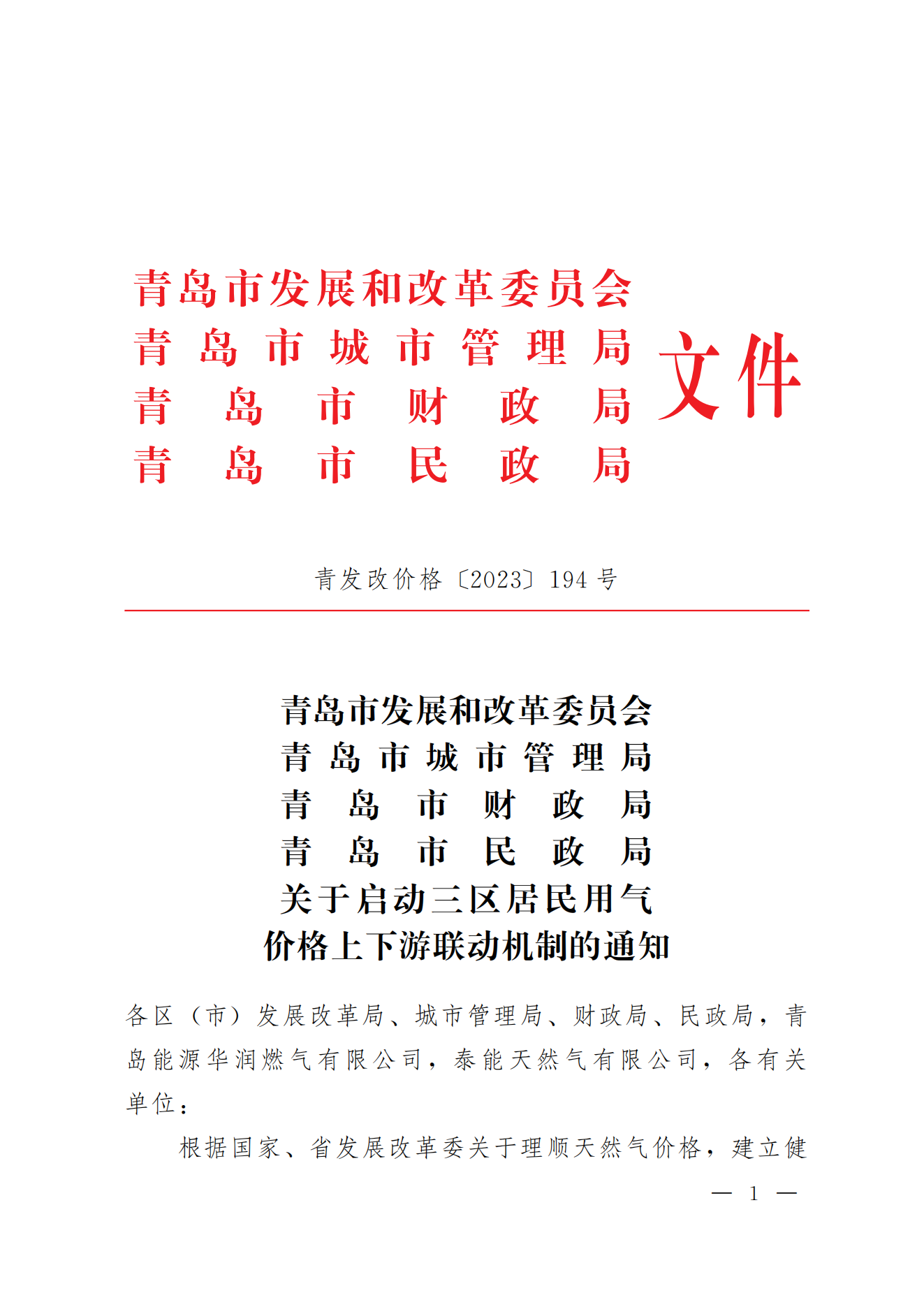 青发改价格〔2023〕194号《青岛市发展和改革委员会 青岛市城市管理局 青岛市财政局 青岛市民政局 关于启动三区居民用气价格上下游联动机制的通知》.pdf