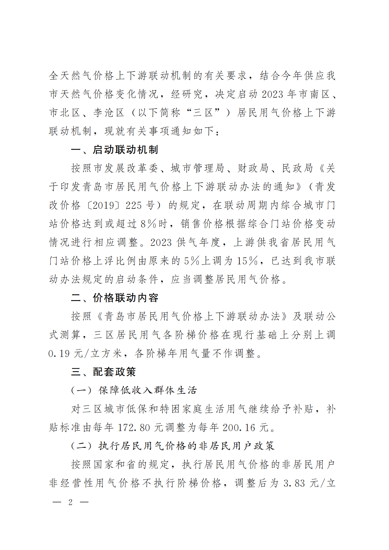 青发改价格【2023】194号青岛市发展和改革委员会 青岛市城市管理局 青岛市财政局 青岛市民政局 关于启动三区居民用气价格上下游联动机制的通知