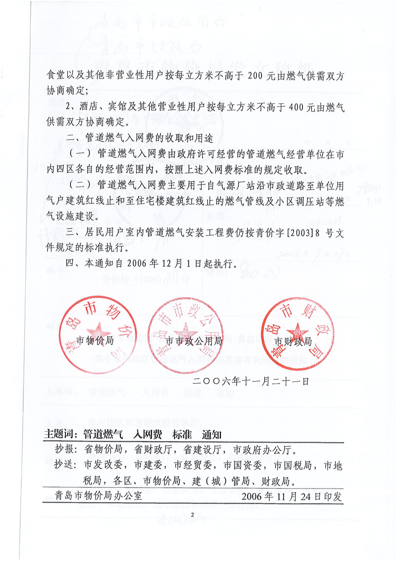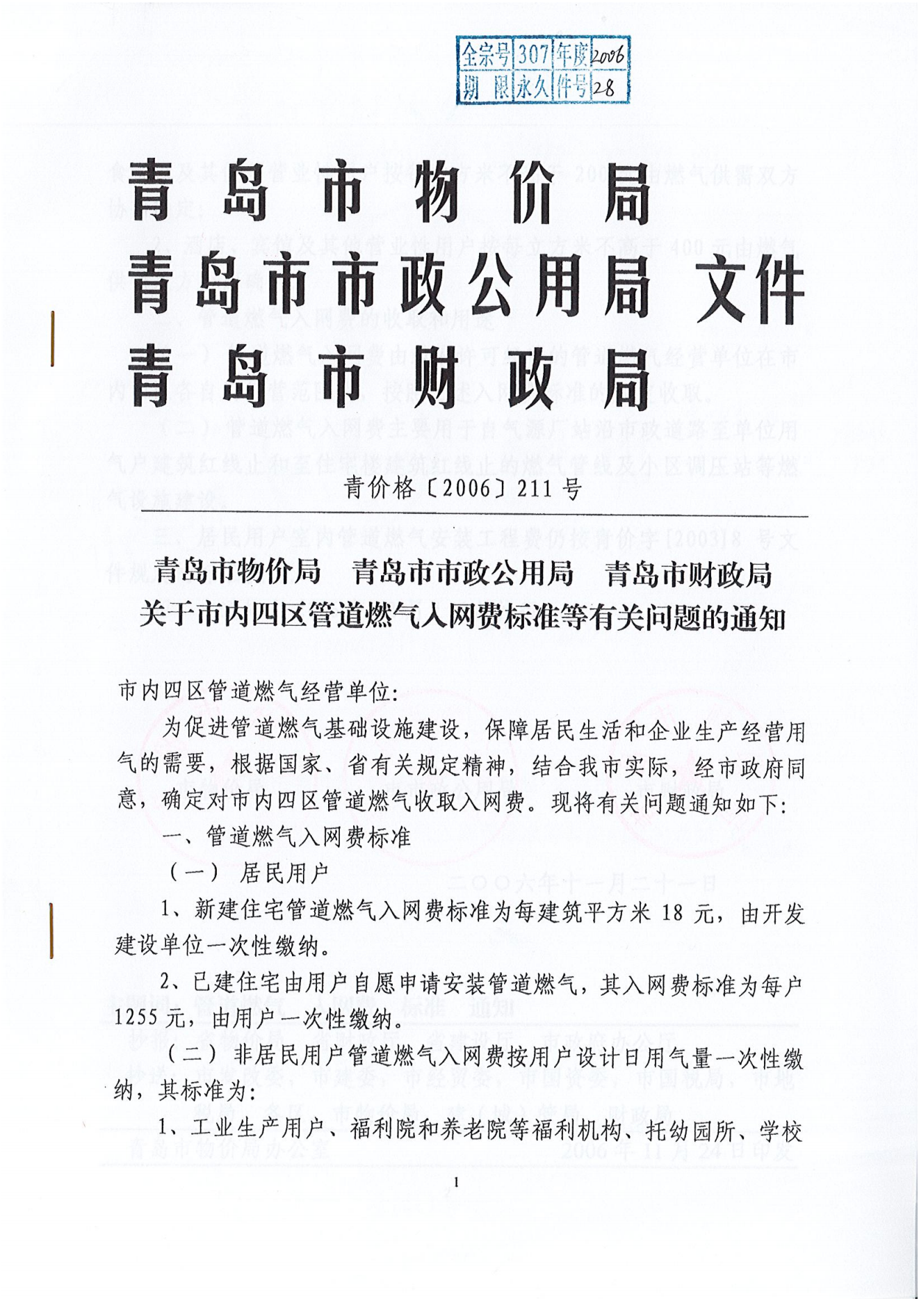 青价格【2006】211号 青岛市物价局 青岛市市政公用局 青岛市财政局 关于市内四区管道燃气入网费标准等有关问题的通知