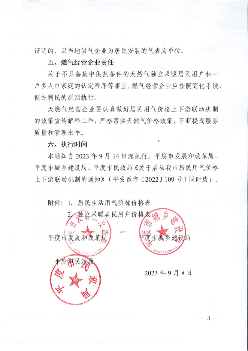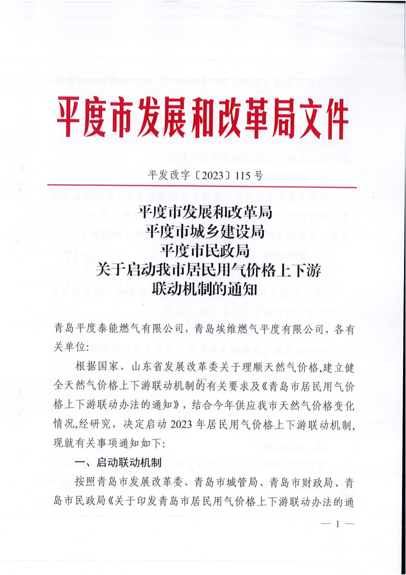 平发改字【2023】115号 平度市发展和改革局 平度市城乡建设局 平度市民政局 关于启动我市居民用气价格上下游联动机制的通知