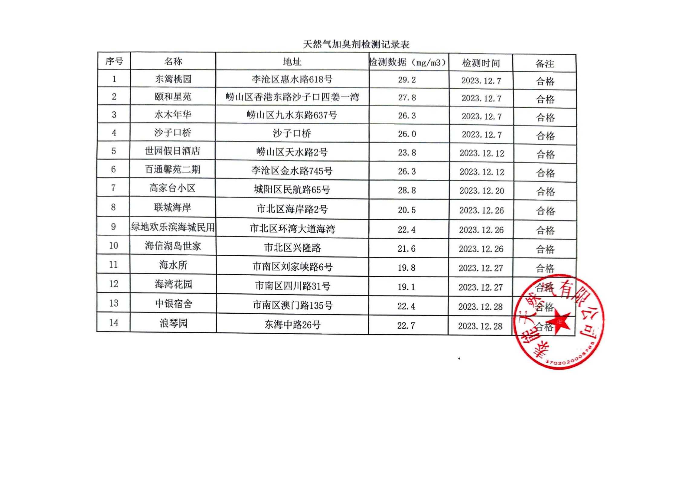 天然气加臭剂检测记录表(2023年12月)